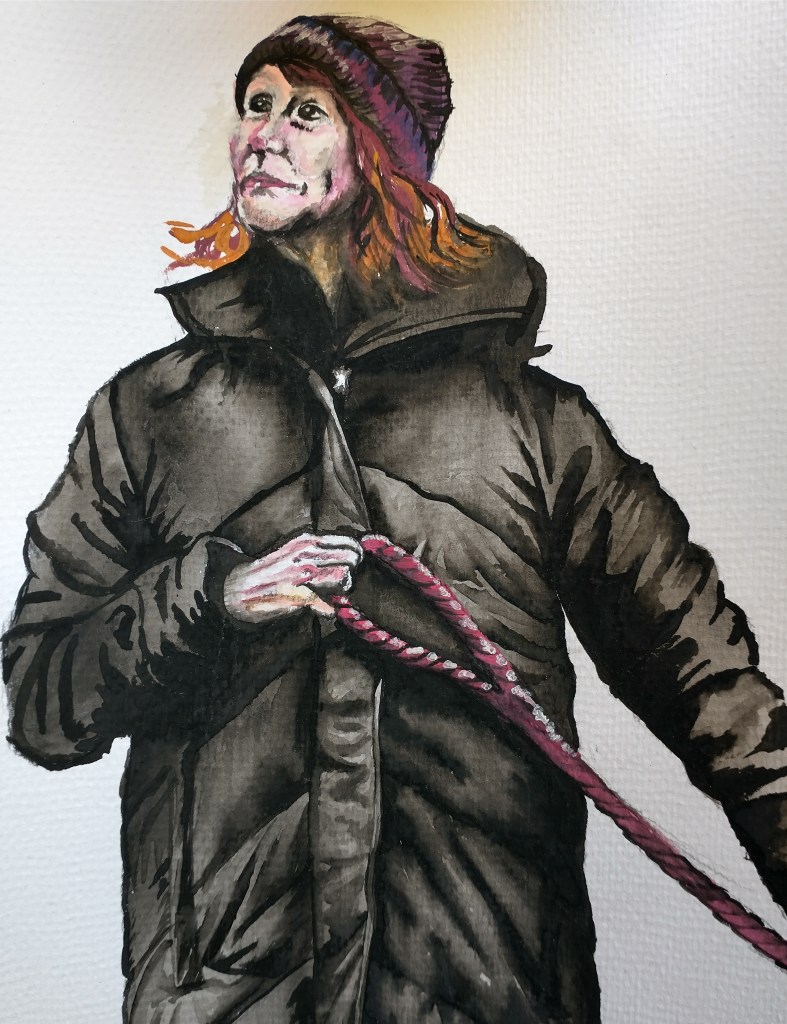 Yet another attempt at me in my coat…it’s still not me and the colours of the face are a bit weird…but the coat looks great! The best thing about it is that I was completely absorbed by the process. Trying to capture human expression is completely compelling to me. Which lines are the ones that matter the most? Which tiny fleck of light in an eye can change an angry look to a cheeky one? Even though I wasn’t successful here, I don’t mind because I still want to keep exploring. I guess I know how hard it is and therefore don’t have unrealistic expectations. On the other hand, if something is presented as easy and it still looks like crap…